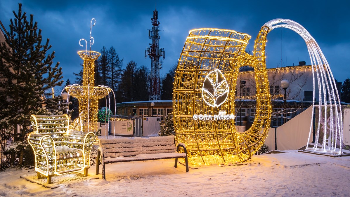 The slopes of Góra Parkowa are an oasis of tranquility and nature. In summer, the beautiful, old park tempts with birds singing, with its many alleys, corners and gazebos hidden from prying eyes. Here you can admire exotic tree species; feed swans, swimming nobly around the city pond and squirrels willingly helping themselves to some nuts. In some places, there are healing springs that offer mineral waters from the heart of the Earth. At the top there are beautiful views of the Beskid, and many hiking and walking trails. Children can go wild on paradise slides and the pontoon slide,